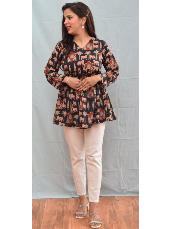 Sanganeri Printed V-Neck Gathered Pure Cotton Longline Empire Top